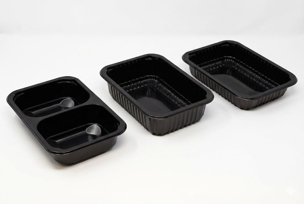 caserolă termosudabilă neagră, caserolă PP, caserolă 187×137, caserolă cu 1 compartiment, caserolă cu 2 compartimente, ambalaje catering, ambalaje take away, caserole mâncare caldă, caserolă termosigilabilă